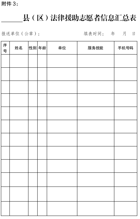 2.全市法律援助志愿者招募工作应于2023年3月15日前招募完成,法律援助志愿者申请表(见附件2)、旗县区法律援助志愿者信息汇总表(见附件3)加盖公章请于2023年3月20日前报送市司法局法律援助科506房间。